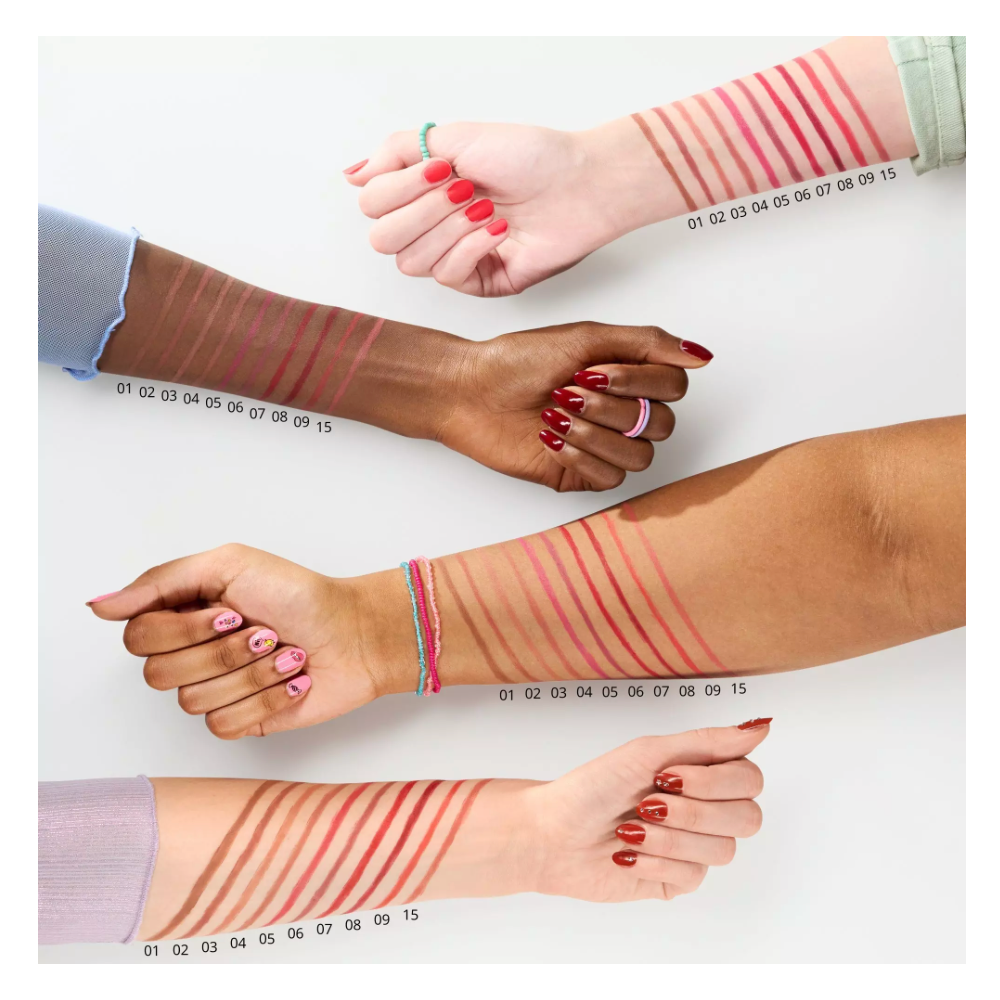 المكونات: ميثيل تريميثيكون، شمع الأرز (أوريزا ساتيفا)، فلورفلوغوبيد الاصطناعي، تريميثيل سيليوكسي سيليكات، أوكتيل دودكانول، كوبوليمر الأكريلات/دايميثيكون، زيت الأفوكادو (بيرسيا غراتيسيم)، أسيتات توكوفيريل، هيكتوريت ديستيارديمونيوم، بانتيريثريت تيترا-دي-ت-بوتيل هيدروكسي هيدروكيناميت، كربونات البروبلين، عطر، CI 15850 (أحمر 6، أحمر 7 لكة)، CI 77499 (أكسيد الحديد).