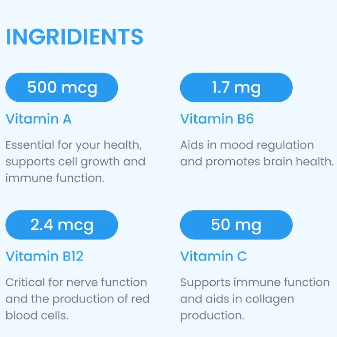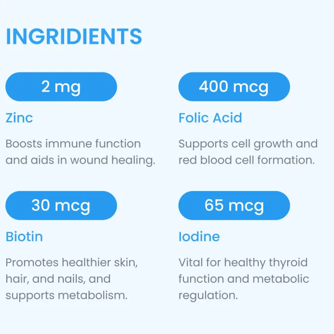 - صحة ورفاهية عامة: فيتامين A، النياسين، اليود، وحمض البانتوثنيك، من بين مكونات أخرى، توفر مجموعة شاملة من الفيتامينات والمعادن الضرورية للصحة العامة والرفاهية.
