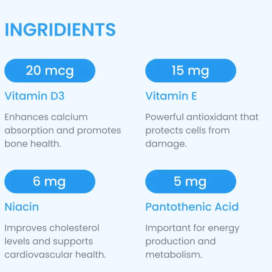 - تقوية العظام: فيتامين D3 والكالسيوم يساهمان في صحة العظام، مما يدعم قوة وكثافة العظام.