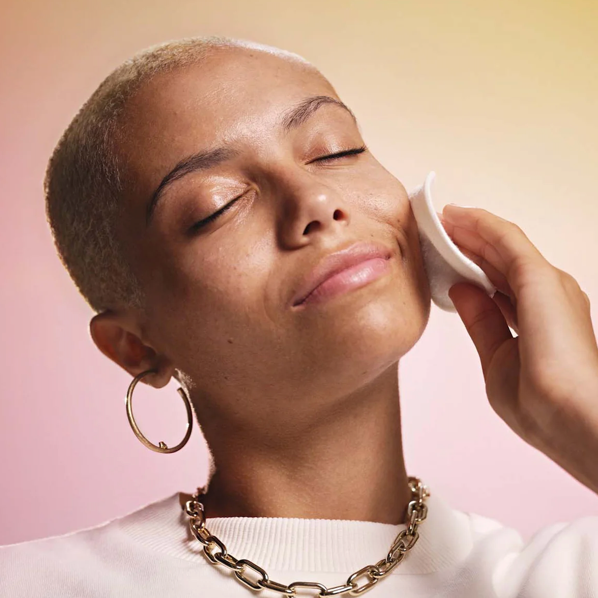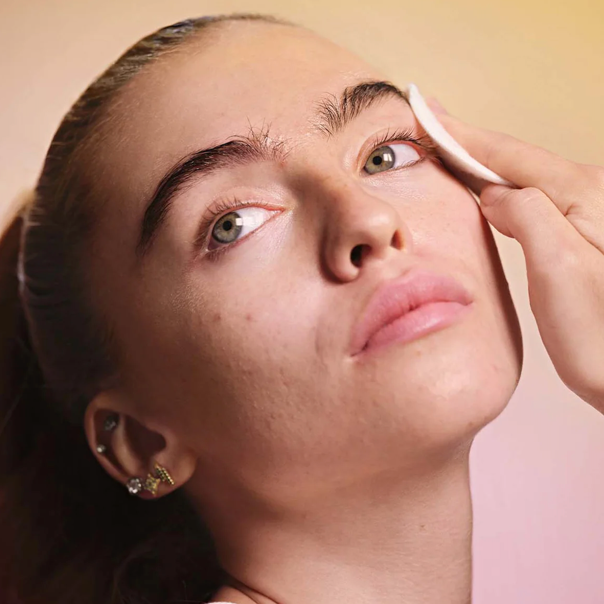 Apply our Bi-Phase Cleansing Water to a reusable pad and sweep over the skin.