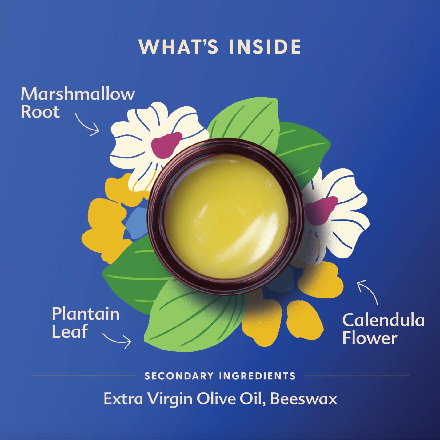 Extra virgin olive oil*, beeswax*, plantain leaf*, marshmallow root*, calendula flower*