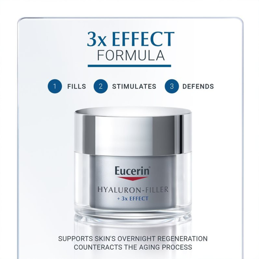 Eucerin Hyaluron-Filler Night treats the first signs up aging by plumping up fine lines and wrinkles for a rejuvenated look while supporting skin regeneration. Eucerin’s innovative blend of high and low molecular Hyaluronic Acid, Glycine Saponin and Dexpanthenol delivers a more targeted approach to visibly plumping fine lines and deep wrinkles. High molecular Hyaluronic Acid improves hydration and smooths the outermost layers of skin while low molecular Hyaluronic Acid, which is 40 times smaller (1), penetrates further into the epidermal skin layers where deeper wrinkles originate. Glycine Saponin supports Hyaluronic Acid production in the cells of the dermal layer where the deepest wrinkles are formed. Concentrated Dexpanthenol supports skin’s overnight regeneration process.