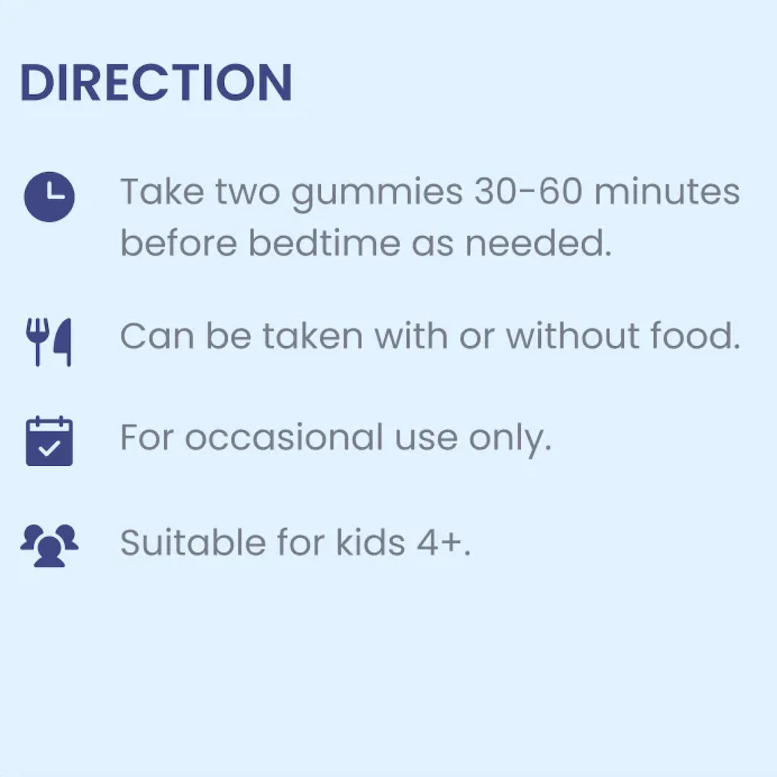 For children, fully chew two (2) gummies 30-60 minutes before bed