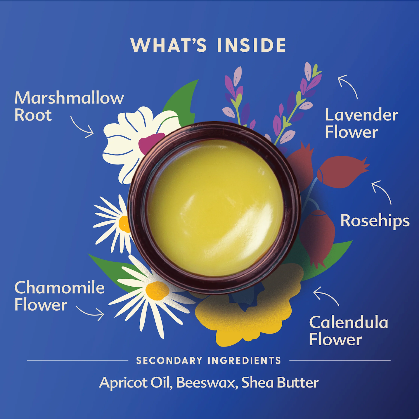 Apricot oil, beeswax*, shea butter*, marshmallow root*, rosehips*, lavender flower*, chamomile flower*, calendula flower*