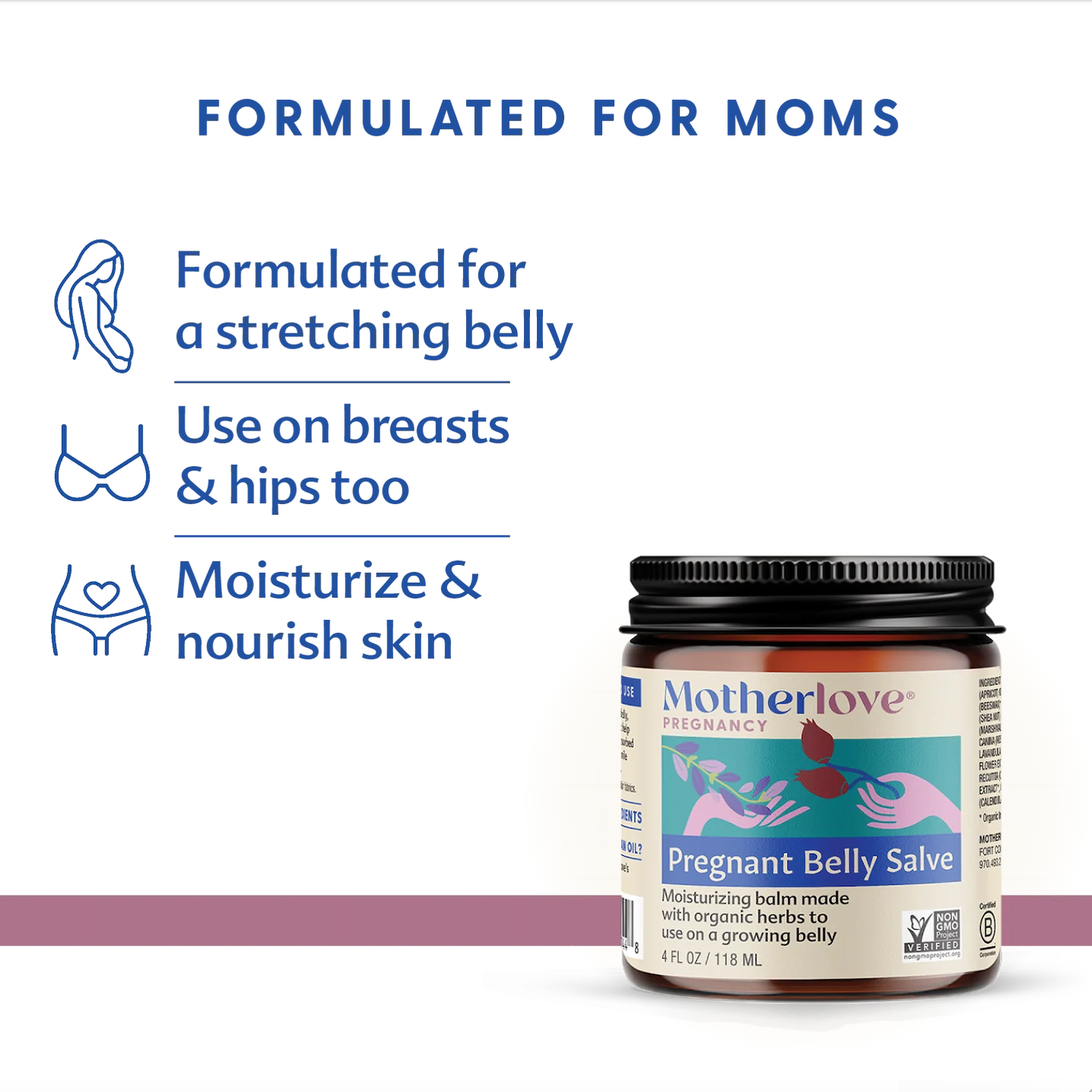 Pregnancy is uncomfortable sometimes. Stretching, growing, and dried out skin from bump, to breasts, to hips can leave you feeling spread pretty thin—literally. Pregnant Belly Salve is moisture-rich and packed with organic herbs that will leave skin feeling supple, soft, and ready to stretch a little more tomorrow.