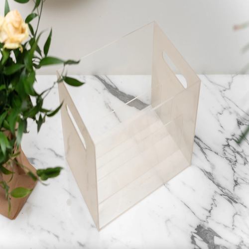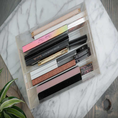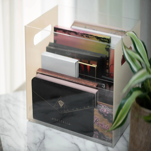 A wide-slot acrylic organizer perfect for eyeshadow palettes, blushers, concealers and powders.