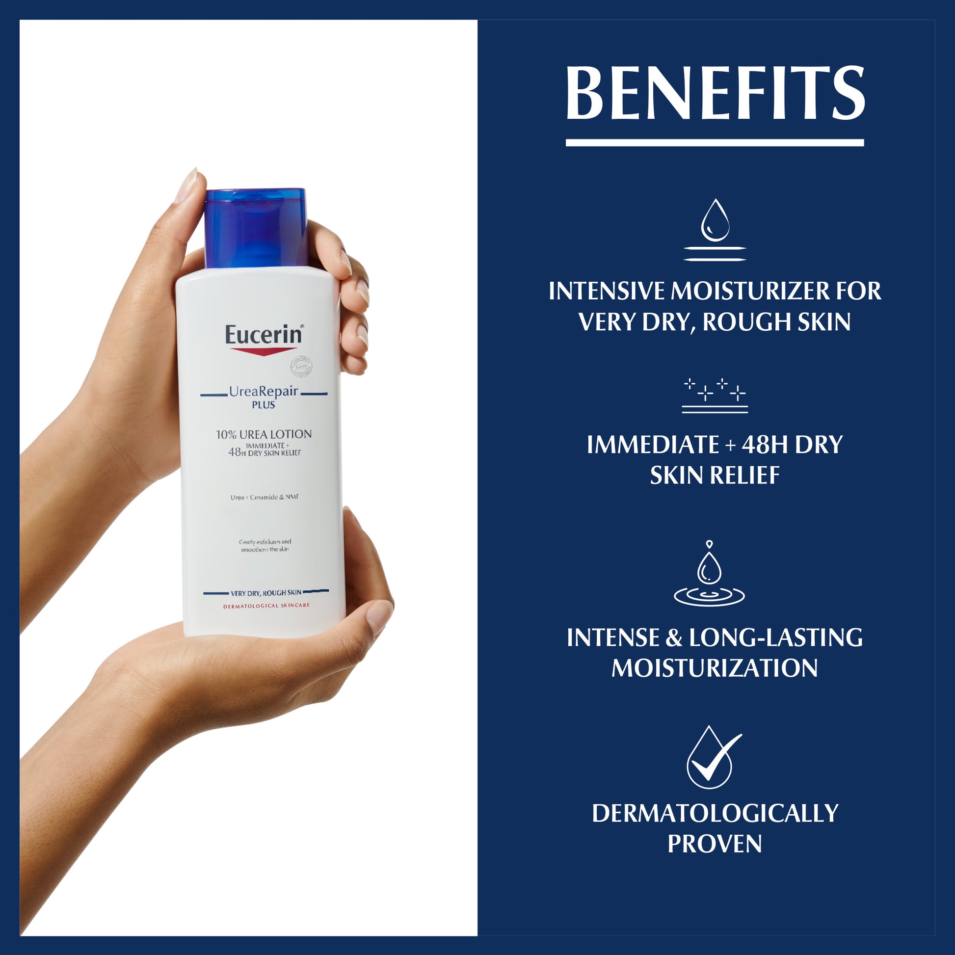 Eucerin urearepair plus 10% urea lotion gives very dry, rough body skin the daily care it needs. It contains a unique combination of ingredients – urea, ceramide and other natural moisturizing factors (nmfs) – which bind moisture in and repair skin´s natural protective barrier to prevent further moisture loss. The formula has been clinically and dermatologically proven to deliver immediate relief and intense, long-lasting moisturization, delaying dryness and roughness for up to 48 hours. Skin is intensely moisturized and looks and feels smooth and supple again. When the skin on our bodies has a stable barrier function, it protects us from external irritants and is able to maintain its optimal level of hydration. But when that barrier is impaired, skin can lose moisture and look and feel dry as a result. The lotion is suitable for mature skin and those with diabetes, psoriasis and keratosis pilaris. It can also be used as adjunctive care.